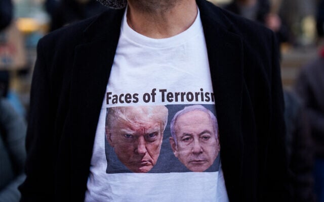 An anti-Israel protester wears a t-shirt with images of US President Donald Trump and Israeli Prime Minister Benjamin Netanyahu during a protest against the war in Iran on March 2, 2026, in New York City. (Adam Gray/ Getty Images via AFP)