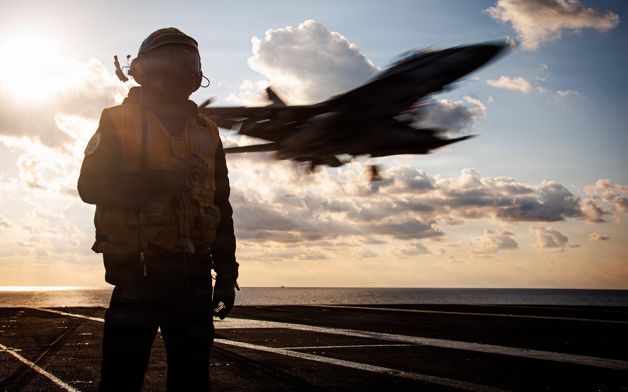 A US sailor stands by as an F/A-18F Super Hornet aircraft lands on the flight deck aircraft carrier USS Gerald R. Ford while operating in support of Operation Epic Fury in the Eastern Mediterranean Sea, March 2, 2026. (US Navy)