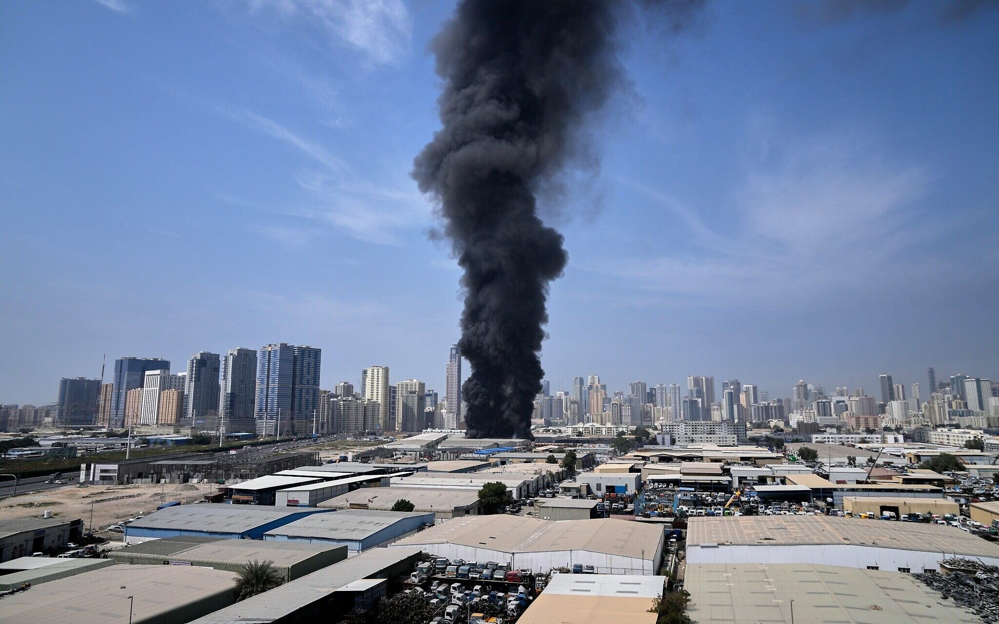A black plume of smoke rises from a warehouse at the industrial area of Sharjah City in the United Arab Emirates following reports of Iranian strikes in Dubai, United Arab Emirates, March 1, 2026. (AP Photo/Altaf Qadri)