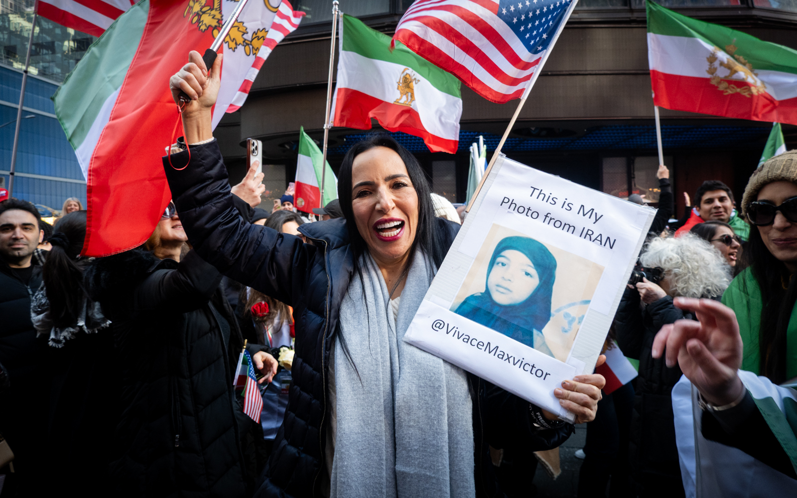A rally in support of US and Israeli strikes against Iran, in Times Square, New York City, March 1, 2026. (Luke Tress/Times of Israel)