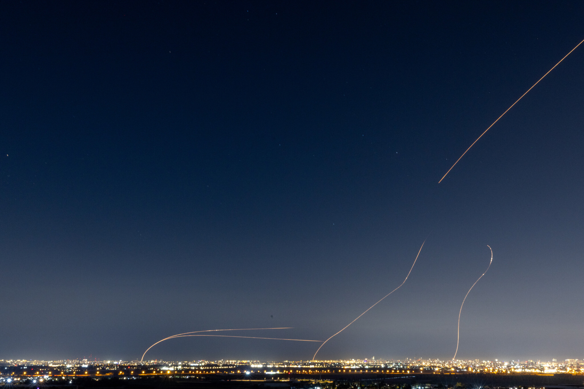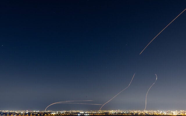Anti-missile batteries fire interception missiles toward incoming ballistic missiles launched from Iran, as seen over central Israel, March 3, 2026. (Yossi Aloni/Flash90)