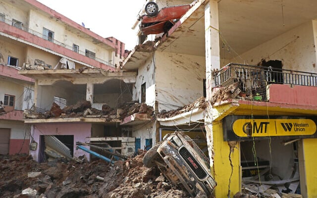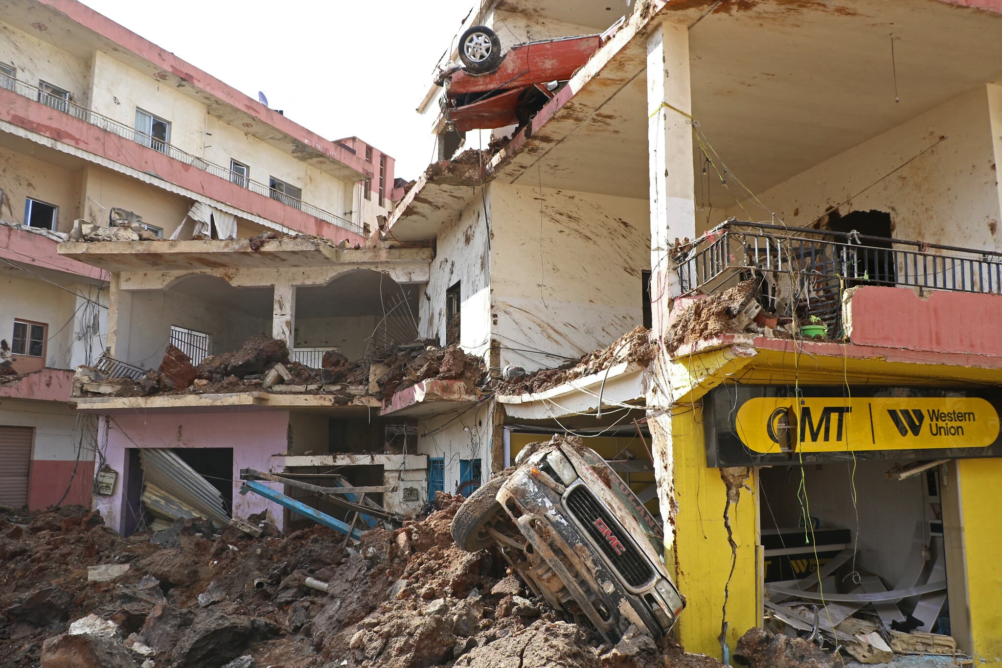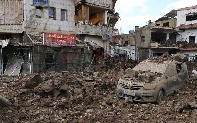 This photograph taken during a media tour organised by the Hezbollah shows destruction at Nabi Chit town after an Israeli military operation in the Bekaa Valley of Lebanon, on March 7, 2026. (Photo by Nidal SOLH / AFP)