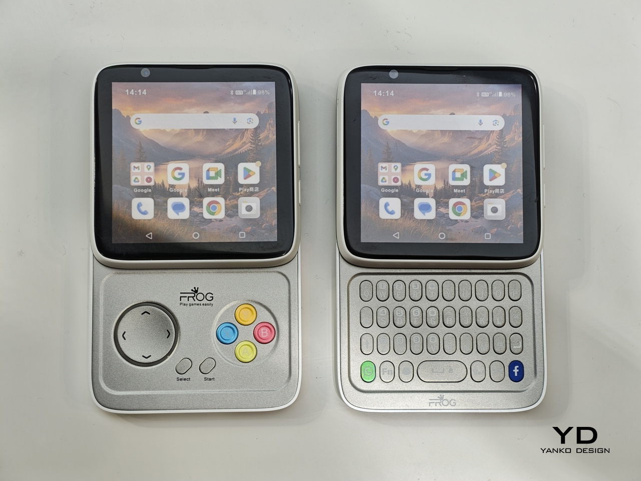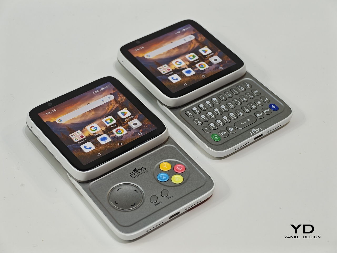 The iFrog RS1 is about the size of a closed fist, built around a 3.4-inch square display that sits on top of a rotating lower section. Twist it open, and you get one of two things depending on which variant you’re holding: a full QWERTY keyboard with raised, tactile keycaps, or a gamepad with a D-pad, a four-color face button cluster, and Select/Start buttons. Both run Android on a MediaTek Helio G18 chipset, with storage and RAM left open for whoever configures the platform.