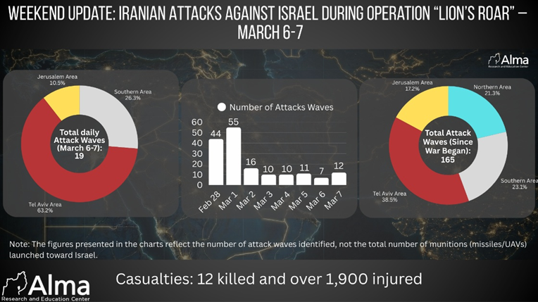 During the weekend (March 6–7), 19 Iranian attack waves toward Israel were identified using ballistic missiles. Most of the attacks were directed toward the Tel Aviv area (63.2%), while 26.3% of the attacks were directed toward southern Israel and 10.5% toward the Jerusalem area.