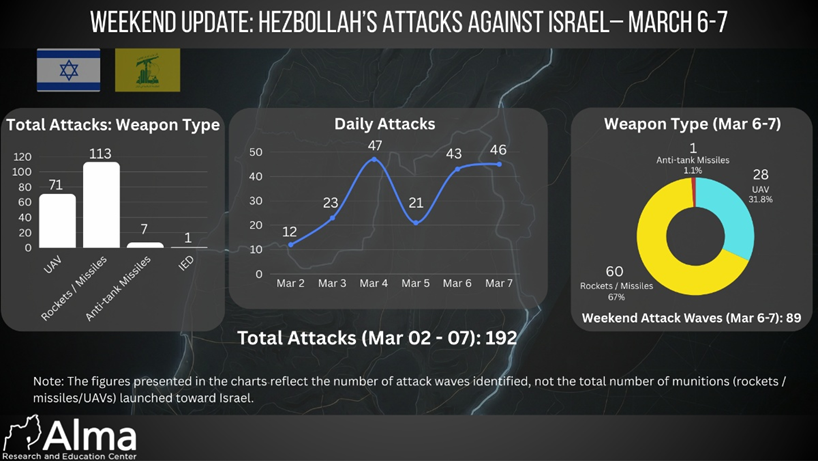 Since Hezbollah joined the war (March 2), it has carried out a total of 192 attack waves toward Israeli territory, including launches of rockets, missiles, and UAVs (the number refers to the number of attack waves, not the number of munitions fired toward Israel).
