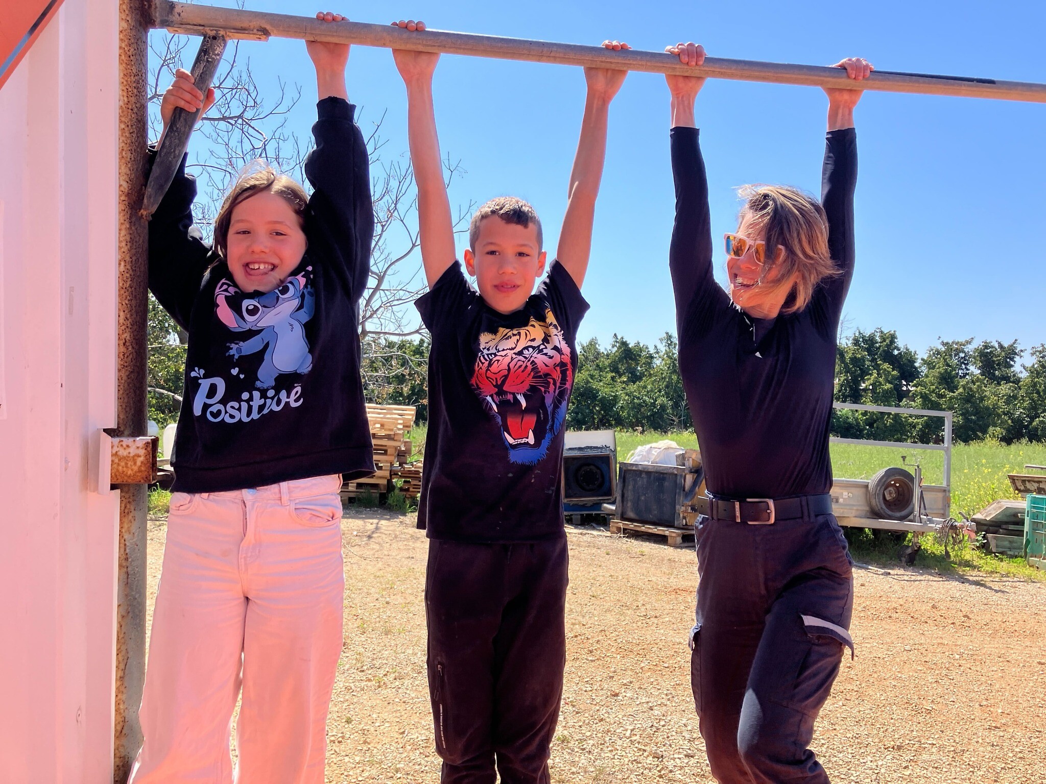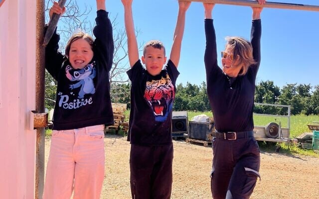 Michal Schwartz, right, hangs on an exercise bar with her children near her FLOW exercise studio in Moshav Liman on March 10, 2026. (Diana Bletter/Times of Israel)