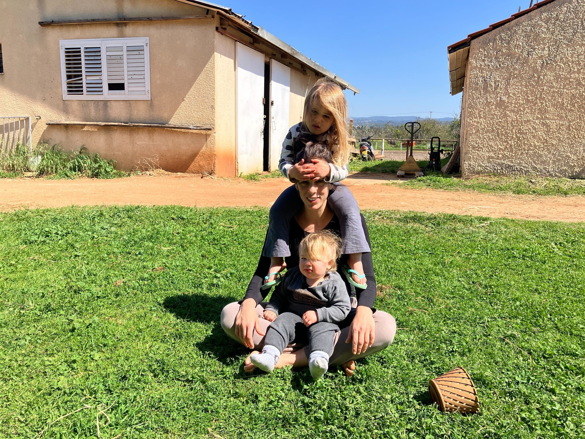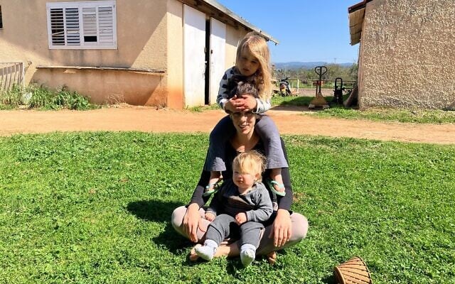 Maya Yaacobi, center, with two of her daughters in Moshav Liman on March 10, 2026. (Diana Bletter/Times of Israel)