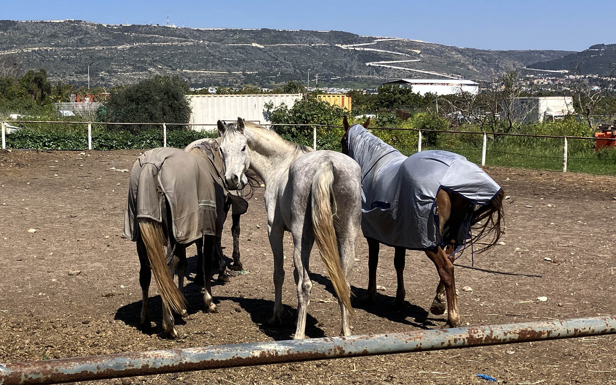 Horses stand in Assif Cohen’s farm in Moshav Liman, with the border of Lebanon in the distance. (Diana Bletter/Times of Israel)