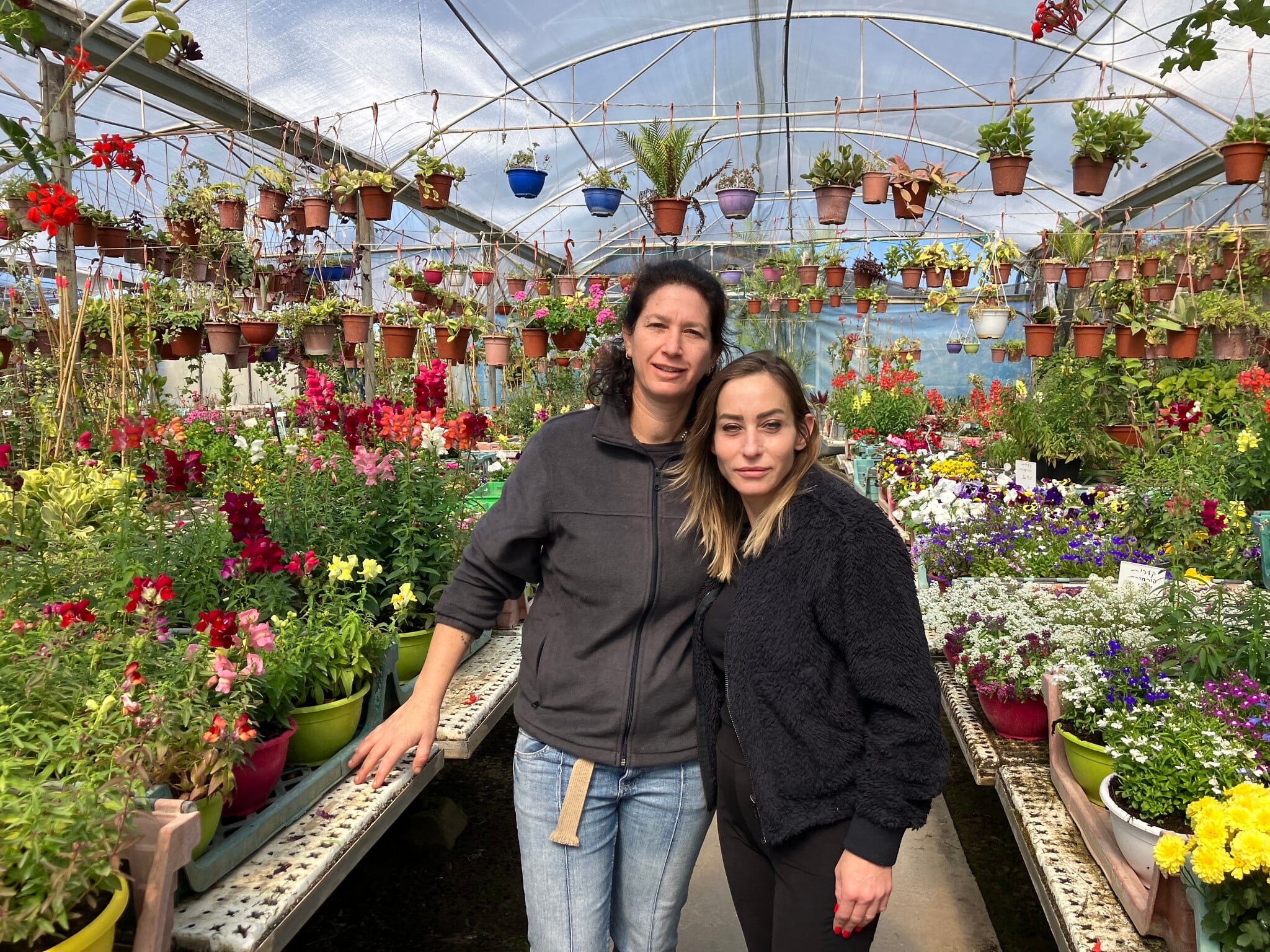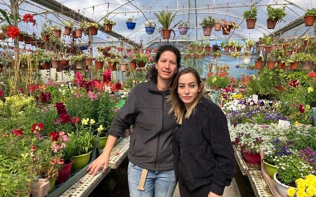 Sigal Malachi, left, and Hadas Harlap, community coordinator, stand in Malachi’s Nursery in Moshav Liman on March 10, 2026. (Diana Bletter/Times of Israel)