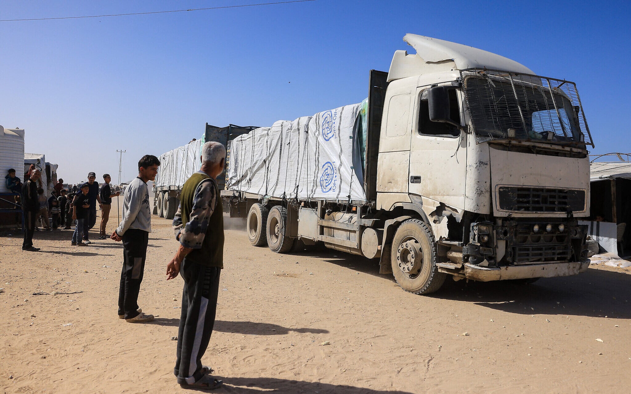Palestinians look on as trucks carrying humanitarian aid arrive in Khan Younis in the southern Gaza Strip on February 1, 2026. (Bashar Taleb / AFP)