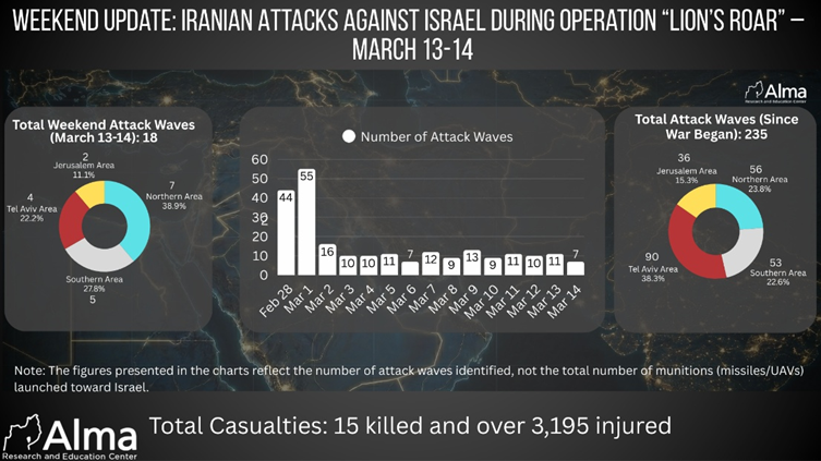 During the weekend (March 13–14), 97 Hezbollah attack waves against Israel were identified. Of these, 82 attack waves (84.5%) were carried out using rockets and missiles, 11 attack waves (11.3%) using UAVs, and 4 attacks using anti-tank missiles.