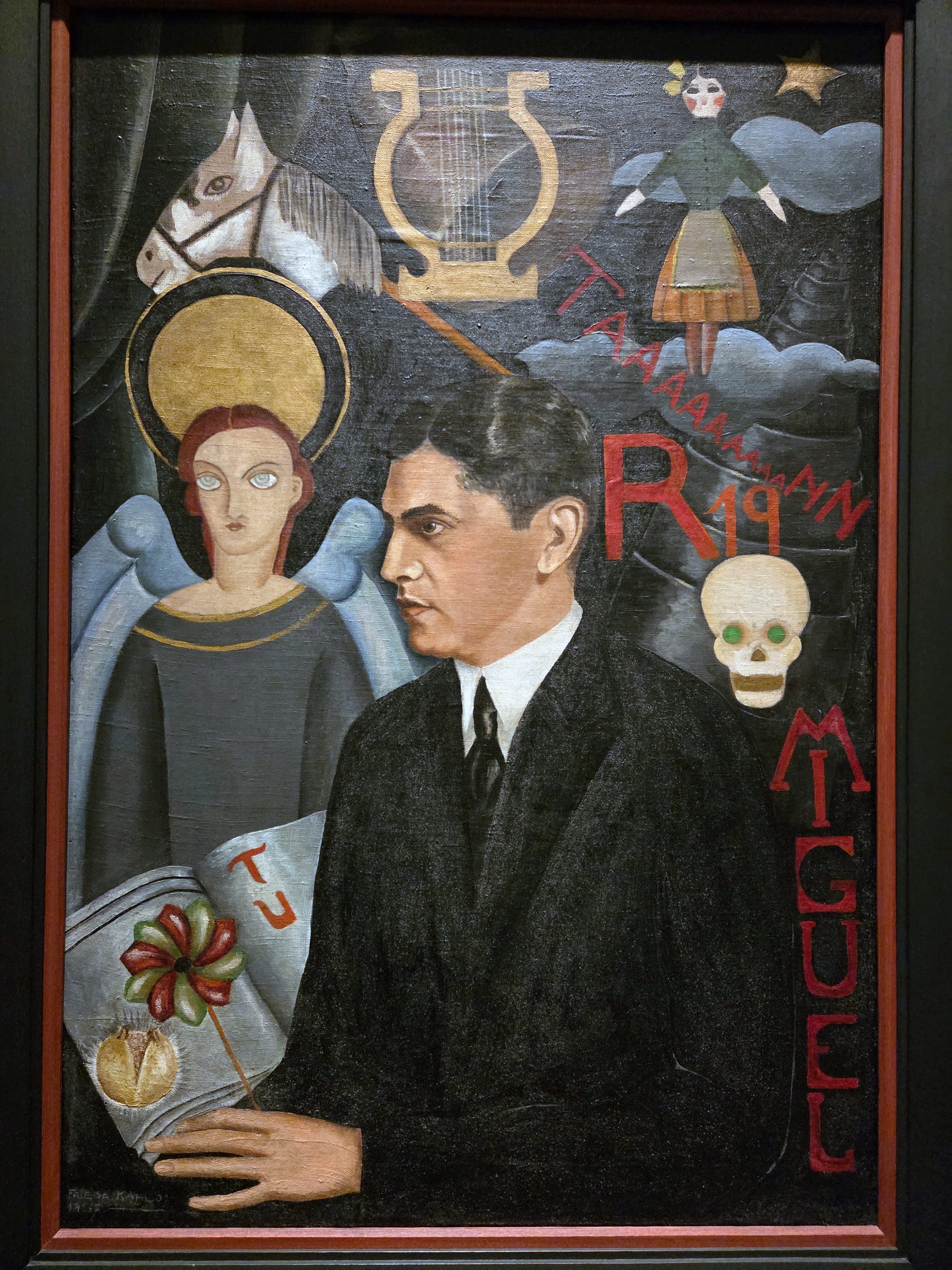 Left: Frida Kahlo, “Untitled (known as Pancho Villa y Adelita)” (1927), oil on canvas; right: Frida Kahlo, “Retrato de Miguel L. Lira” (1927), oil on canvas