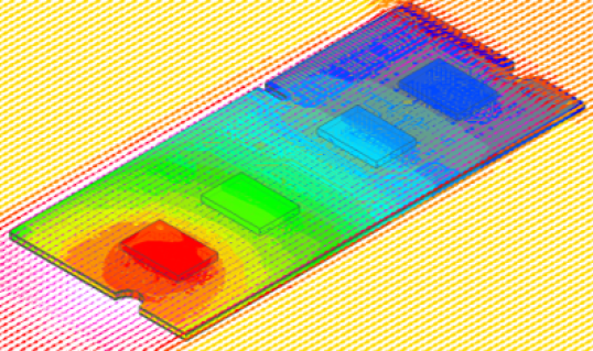 Fig. 1: This heat simulation of a board shows forced air coming from the upper right. If this changed to liquid, then the blue and red chips might be cooler, but the chips in between (if they didn’t receive liquid) may now be red. Source: Synopsys