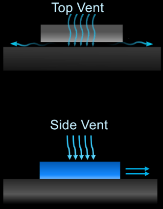 Fig. 2: Two ways of placing a MEMS fan atop a chip. In the top version, a standoff leaves room under the chip for air to move out sideways, or even up and out the top vent. With a side vent, no standoff is needed. Source: xMEMS