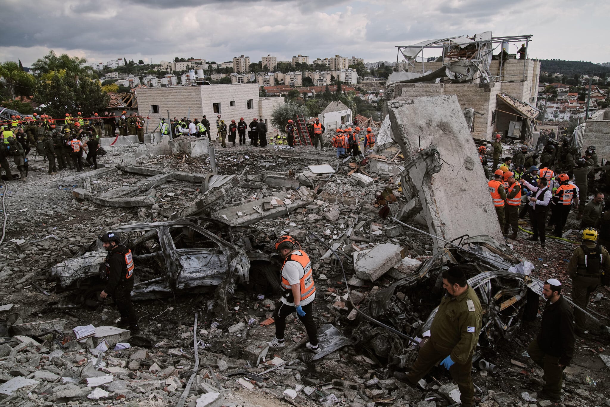 Rescue workers and military personnel operate at the scene where nine people were killed in an Iranian missile strike in Beit Shemesh, Israel, March 1, 2026. (AP Photo/Leo Correa, File)