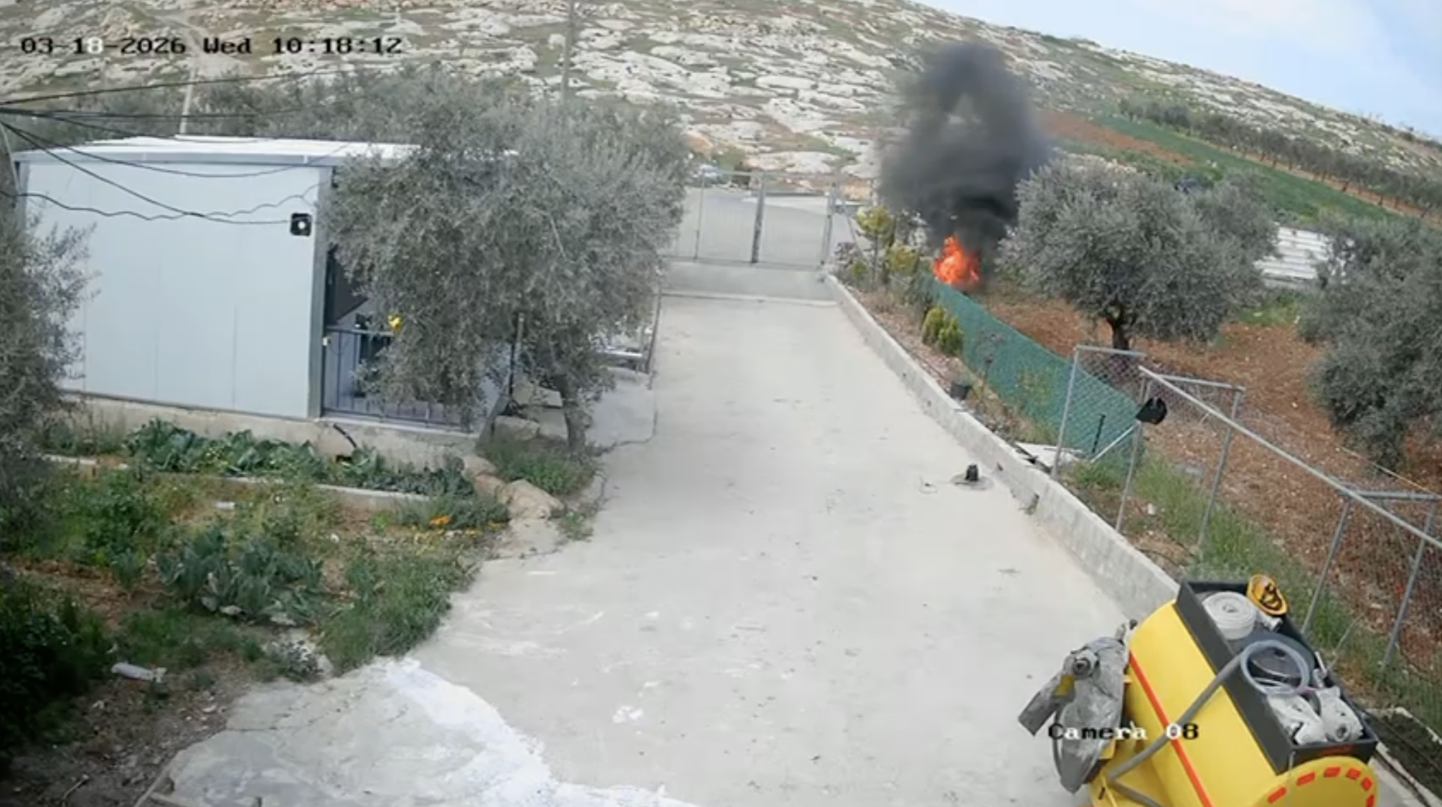 Screenshot of security camera footage showing the results of an arson attack by masked settler extremists against property in the West Bank Palestinian village of Mukhmas, March 18, 2026. (Courtesy)