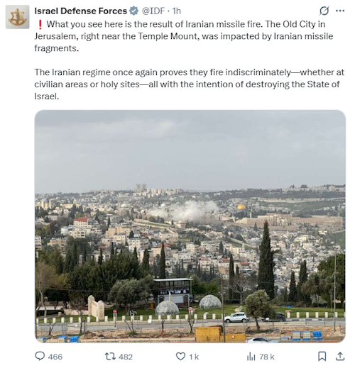 “The Old City in Jerusalem, right near the Temple Mount, was impacted by Iranian missile fragments,” the Israeli military wrote on X.