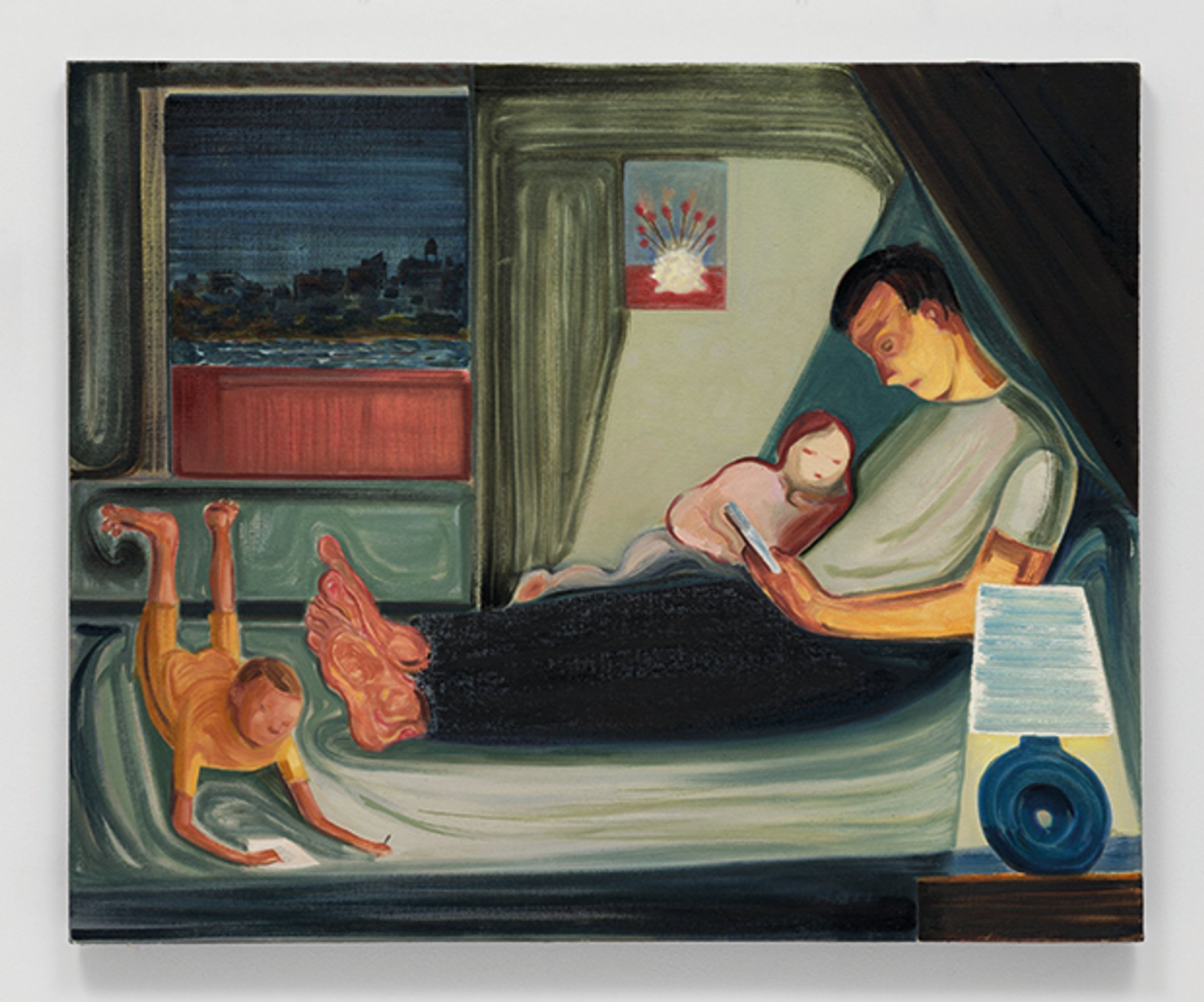 Though the scale is smaller, the ambitions are no less grand. Eisenman’s series focuses on three primary locations of “middle-class living”: home, work, beach. A man sketches a vase of flowers, a woman sits forlornly on the sand, a father stares at his phone as two kids crawl around him. These heavily overworked and reworked pieces are filled with trash and detritus, shadows and darkness. The effect is uncomfortably claustrophobic. These are paintings filled with ennui and tedium, a discomfiting sense of powerlessness and boredom, as time ebbs away and the world falls apart. Eisenman’s cryptic approach has always made her something of a painter’s painter, but these smaller, contemplative, critical images are her at her most intimate, and most inviting.