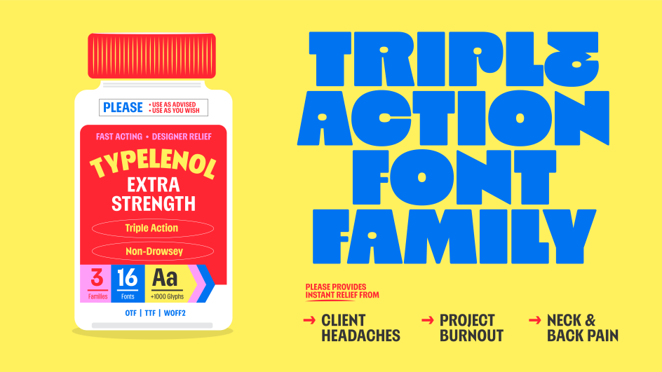 The result is a type family of three distinct subfamilies—Please, Please Display, and Please Poster—each with a slightly different default character set and, therefore, a slightly different typographic voice. Rather than burying alternate glyphs in stylistic sets, Caneso built those variations directly into separate font files, making it straightforward to find the right flavour without hunting through OpenType features. Proportions also shift across the weight range: lighter styles feel gently condensed, whilst heavier styles relax toward more expansive forms, even as the overall character stays compact throughout.
