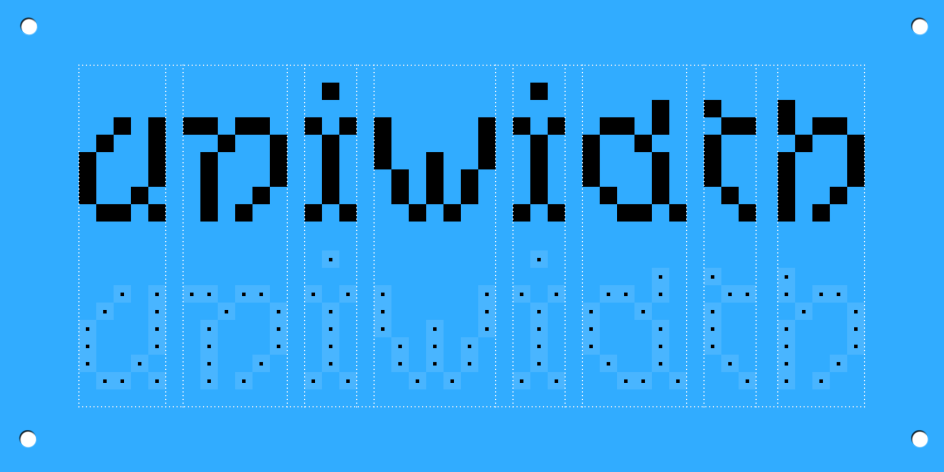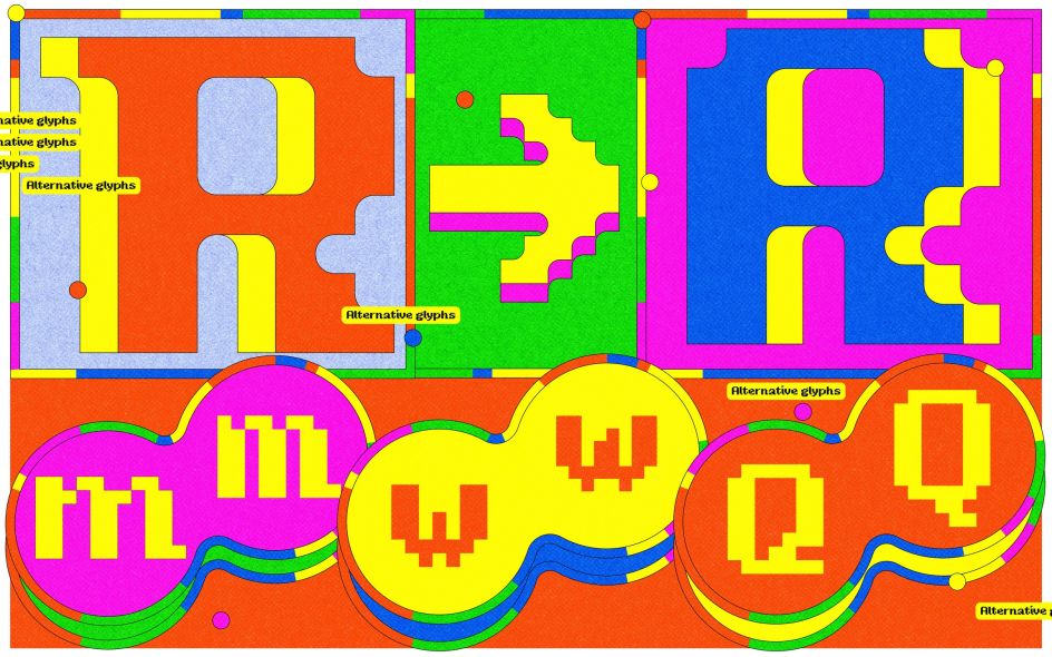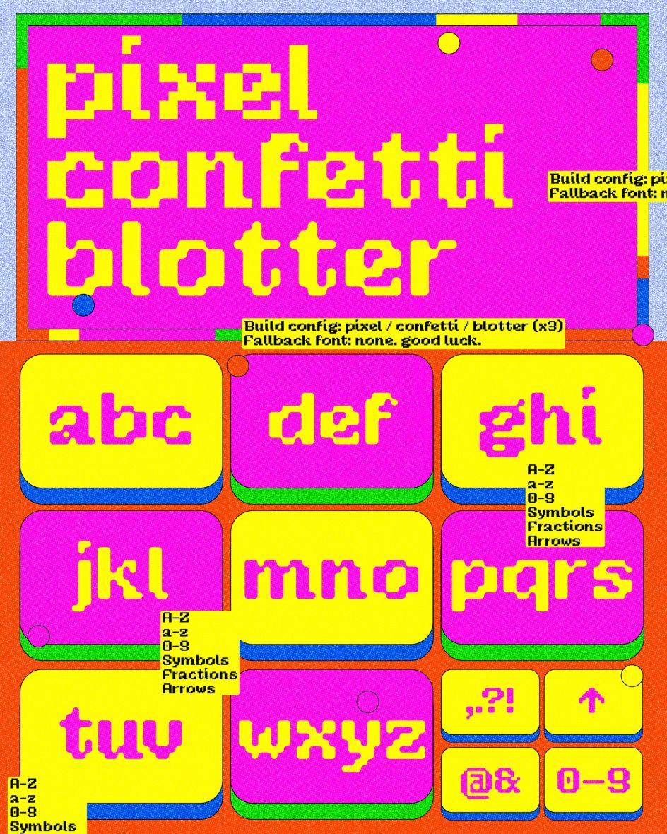 The grid imposed what Mazzarella describes as “brute, binary limitations”: a sharp contrast to the refined micro-decisions of professional type design. But rather than correcting for the unexpected quirks that emerged, she made them design decisions. Width variations that might otherwise have been smoothed away became contextual alternates; initial capital forms were added where they felt right. What began as pedagogy became a full display family of three styles: Pixel, Confetti and Blotter, each approaching the same 8×8 core from a slightly different direction.