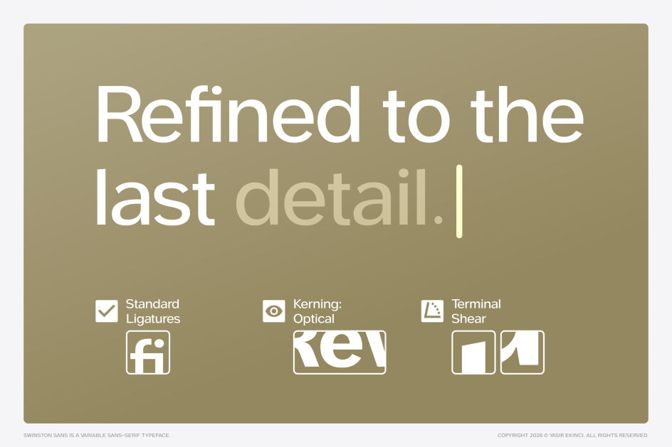 Its signature detail is 15° angled terminals, which give Swinston a distinct visual rhythm that persists across the weight range, preventing the neutrality that afflicts so many geometric sans serifs when pushed toward the light end of their axes. The generous x-height, open apertures and balanced counters ensure legibility at small sizes without sacrificing presence at large ones.