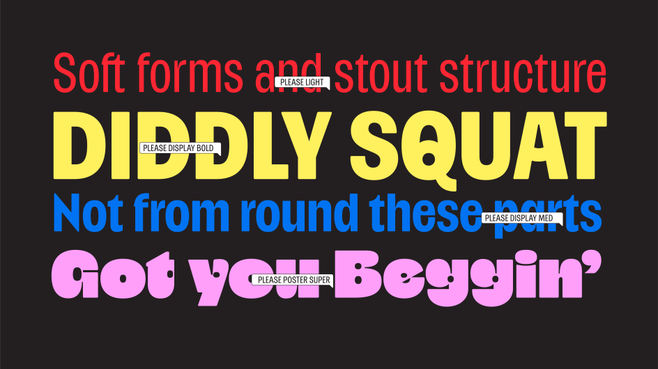 At the extreme end—the Poster subfamily, running from Heavy to Jumbo—things get, as Caneso puts it, “delightfully strange”. Exaggerated counters and bold shapes produce forms that hover between familiar and alien, functional and purely expressive. Ultimately, Please rewards those willing to push it, offering one typographic personality at comfortable display weights and an entirely different one at the limits.