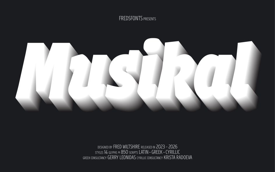 After three years in development on Future Fonts, Fred Wiltshire’s Musikal has reached v1.0: a significant milestone for a typeface that began with a conscious act of divergence. Herman Ihlenburg’s Obelisk (1880s) served as the starting point: a high-contrast, ornamental display face of considerable geometric rigour and decorative confidence. Rather than reviving Obelisk directly, Wiltshire took its “playful nature” as a conceptual springboard and built something clearly of the present.