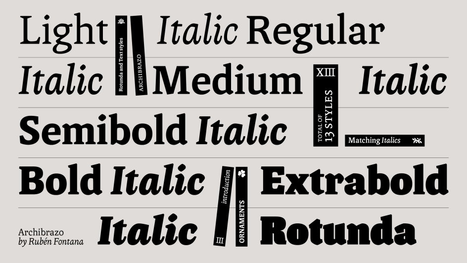 Seven weights address the full span of typographic application, from refined running text to assertive display work. Sculptural wedge serifs and carefully carved countershapes drive the family’s optical performance, creating clear differentiation between strokes and contributing to the legibility that Fontana has positioned as central to the design. The Archibrazo Rotunda weight occupies a special position within the family; a heavier, rounder voice well suited to titling, branding and poster work, where presence matters as much as precision.