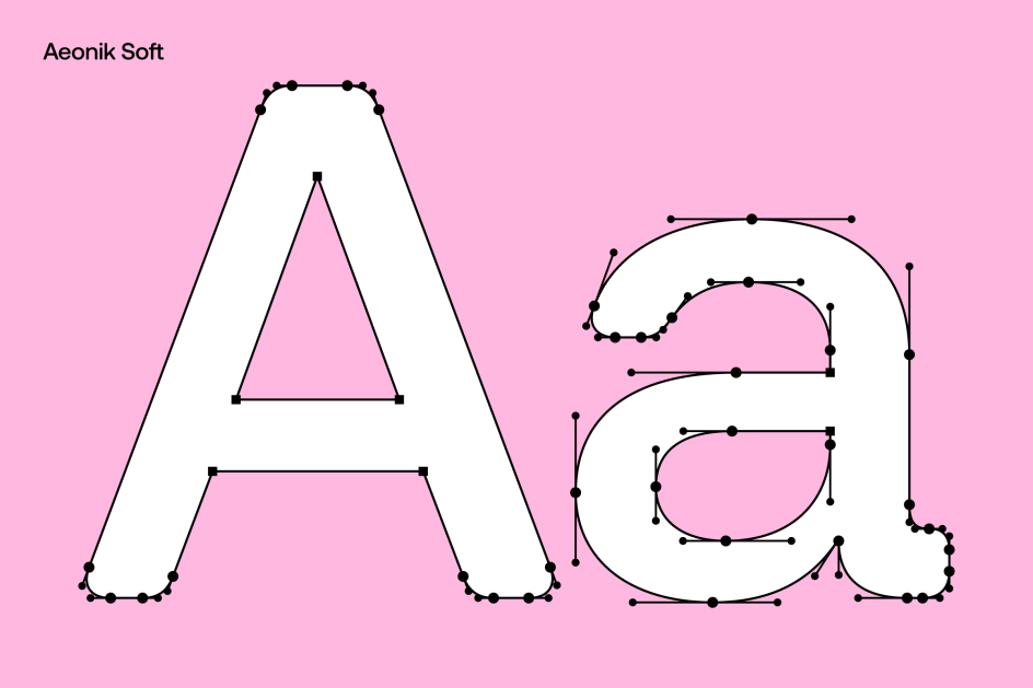 This isn’t a rounded typeface in the conventional sense. The mechanical backbone remains largely intact; what changes is its emotional register. Subtly curved corners replace the harder edges of the original, creating a version that feels more expressive and conversational, but never informal. The result is particularly well suited to editorial work, identity systems, packaging and children’s content; contexts where Aeonik’s modernity benefits from a gentler touch.