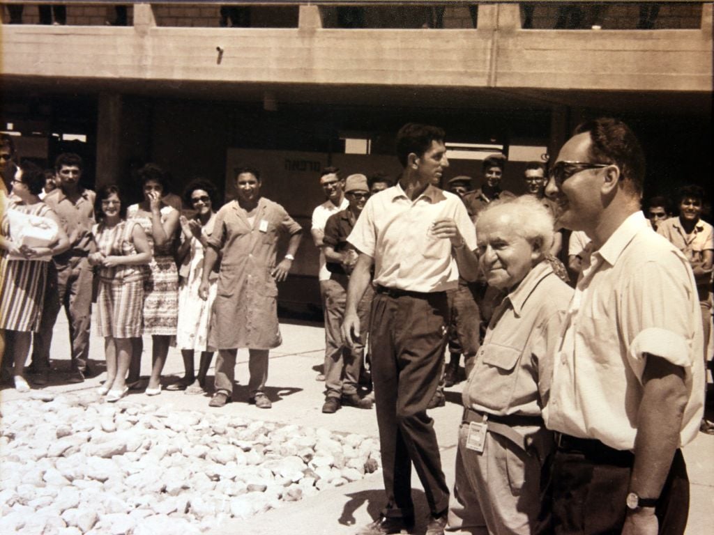 Shimon Peres, right and David Ben-Gurion visit Israel’s nuclear reactor in Dimona (Defense Ministry Archives)