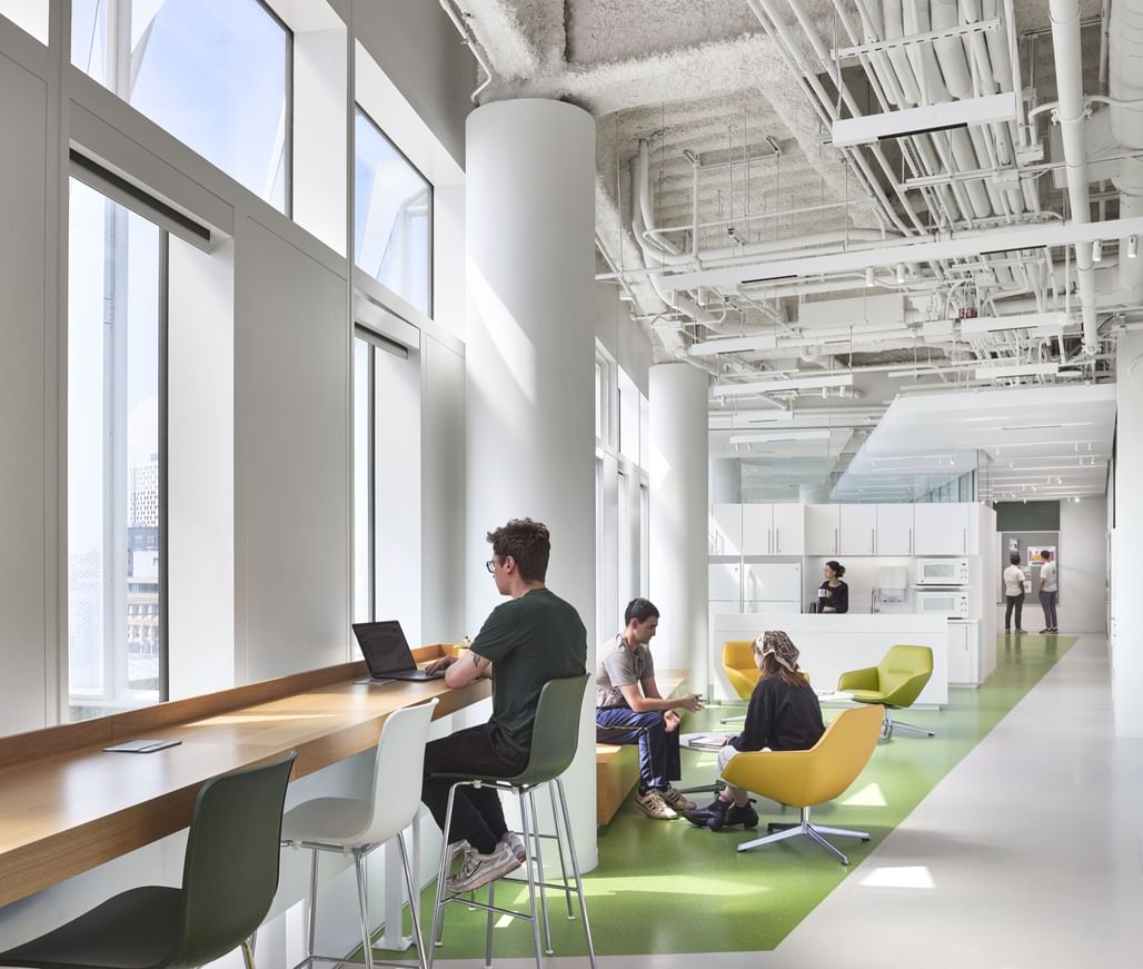 Internally, the 110,000-square-foot facility is organized around energy efficiency and collaboration. Research labs, including high-performance optics labs, chemistry labs, and a nuclear magnetic resonance suite, are interspersed with write-up areas, offices, and shared meeting zones. Double-height spaces and a sequence of terraces, kitchenettes, and open staircases encourage interaction across disciplines. Student-focused amenities include a dedicated clubhouse.