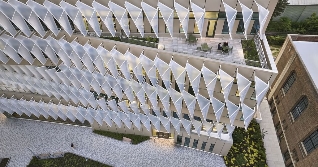 Mounted on a steel frame and fully recyclable, the sunshades reduce embodied carbon by 90 percent compared to conventional aluminum systems. The system diffuses daylight deep into the building while limiting solar gain, easing cooling demands.