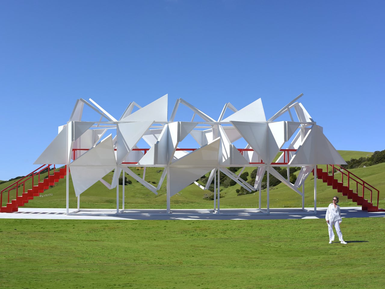 The pastoral setting, open green hills, and clear sky make the white-and-red contrast sharper still. A sculpture this geometrically dense, placed in an undisturbed landscape, is a deliberate provocation, and it earns visual authority because of it. The mesmerizing structure does make one wonder whether the interior experience, walking the catwalk surrounded by folded steel at close range, delivers the complexity it promises from a distance, or does the chaos quietly resolve once you are standing inside it?
