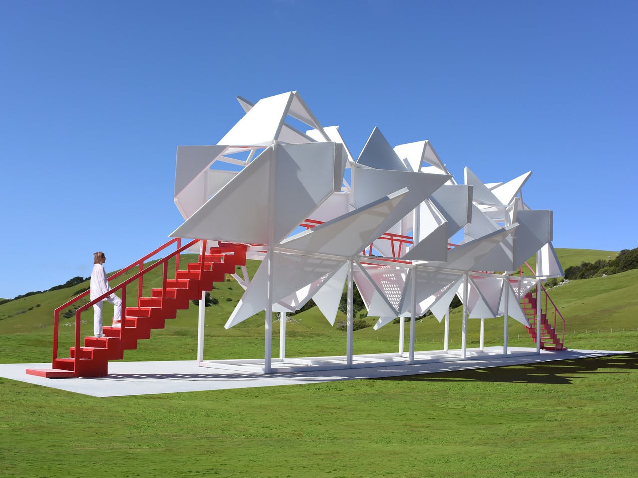Two red staircases, one at each end of the structure, lead up to a mid-level catwalk with red perforated steel grating underfoot and tubular red railings. The red is not subtle. Against the all-white panels and columns, it functions less as a safety feature and more as a graphic element, separating the structure’s circulation path from its expressive surface. Inside, the folded panels create a partially enclosed space, with light cutting through the gaps between triangles at angles that shift as you move.