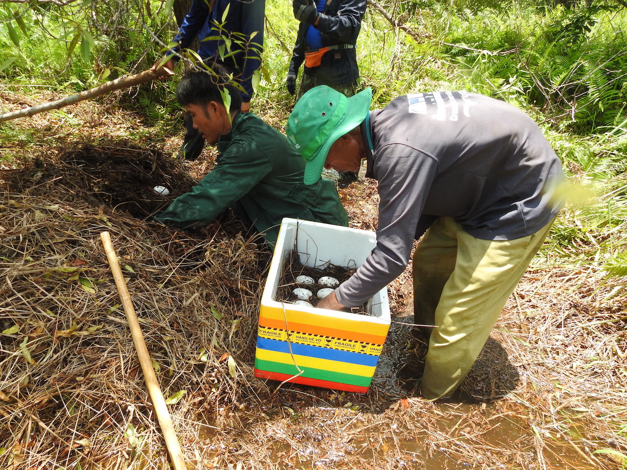 Village conservation teams are paid to collect crocodile eggs and transport them to be incubated in the safety of the village. Photo courtesy WCS Laos.