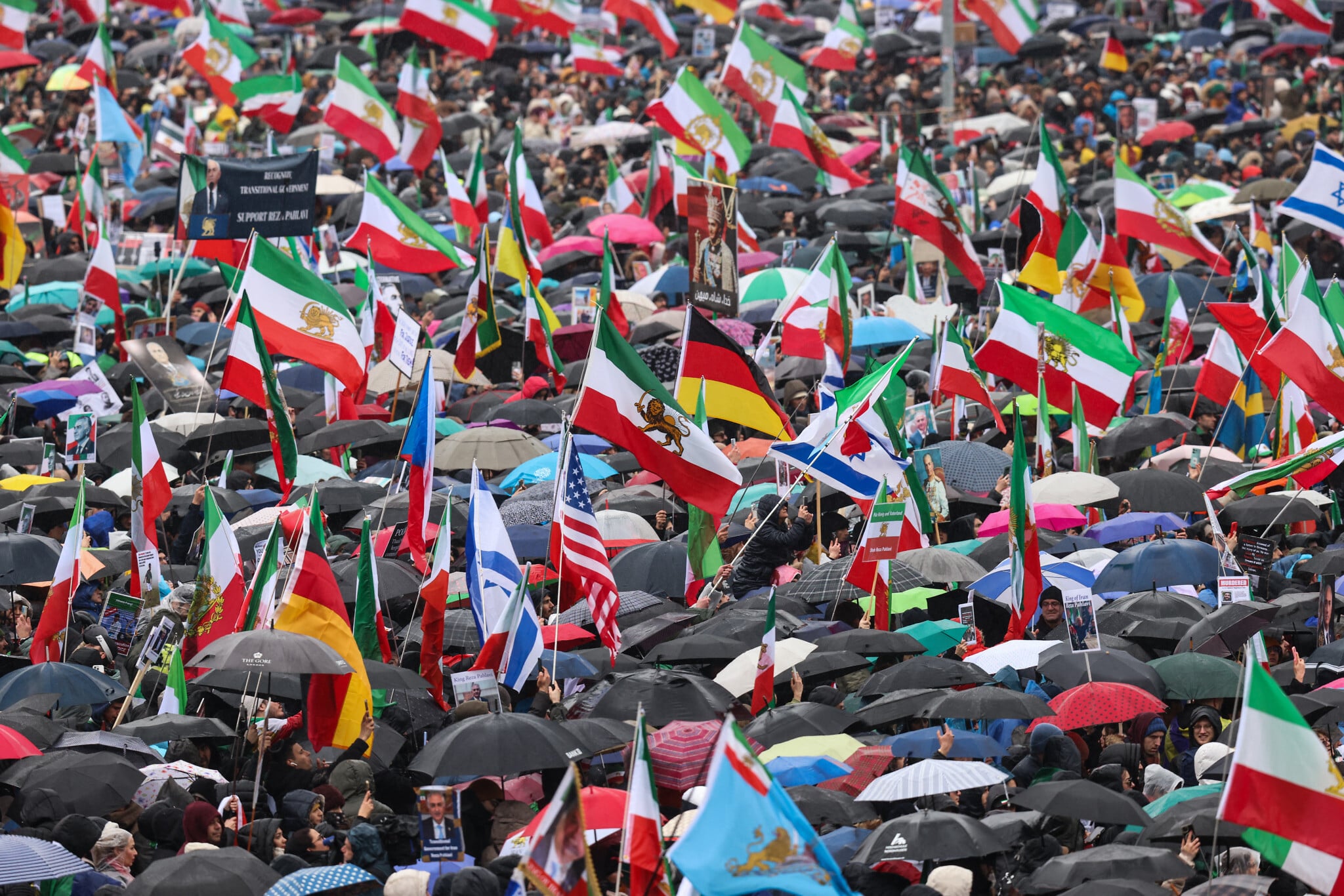 Hundreds of demonstrators protest against the Iranian regime on February 14, 2026 at the Theresienwiese fair grounds in Munich. (Alexandra BEIER / AFP)