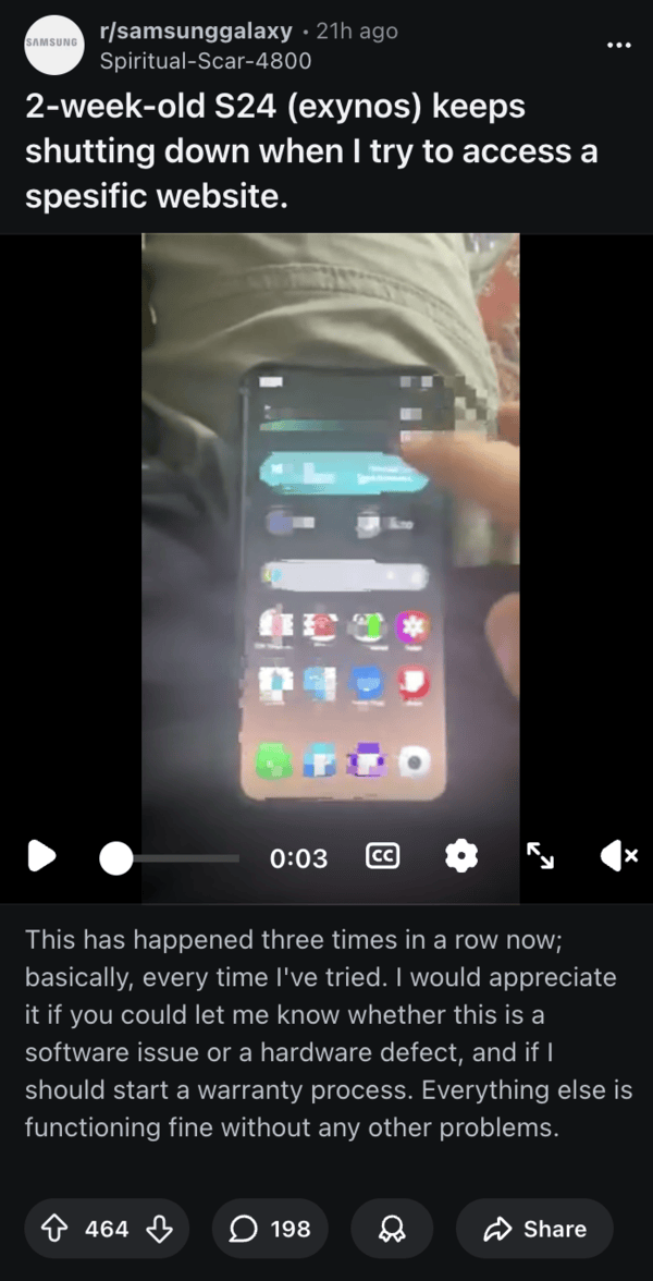 The issue was put in the spotlight by a Galaxy S24 user on Reddit, who posted a video of the phone entirely restarting after opening that website. The comments are flooded with several users reporting the same thing. It’s not isolated to one specific model, and it’s happening for flagships such as the Galaxy S25 Ultra as well as recent midrange phones like the Galaxy A56.