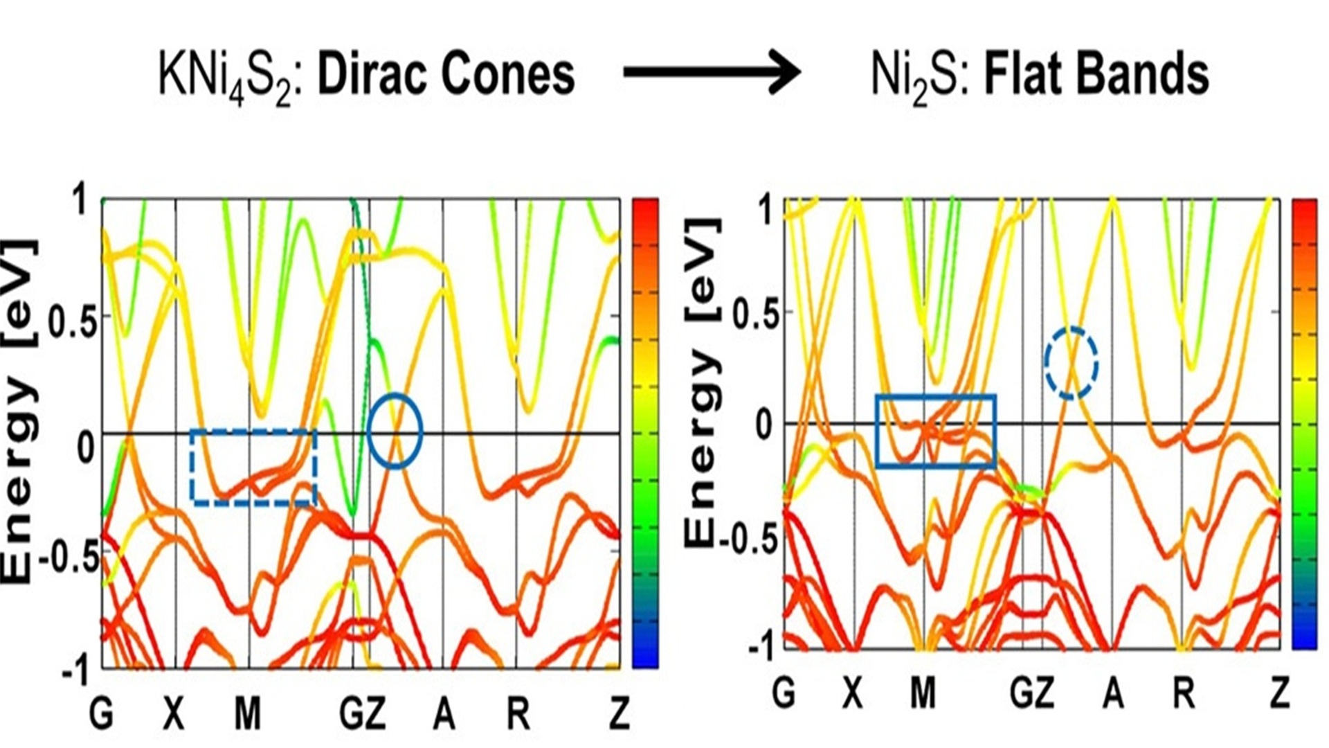 The transition between states and highlights flat bands (in squares) and Dirac cones (in circles).