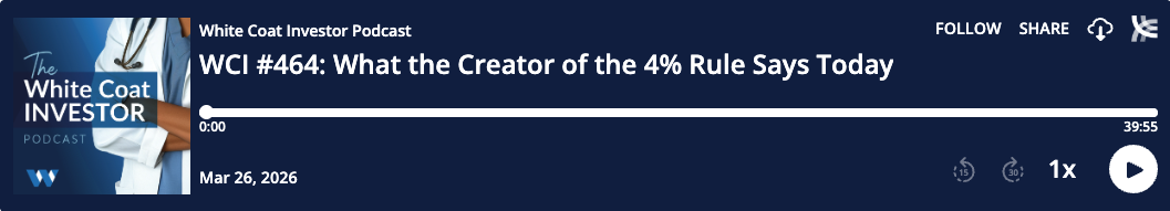 The White Coat Investor podcast is for your entertainment and information only. It should not be considered financial, legal, tax, or investment advice. Investing involves risk, including the possible loss of principal. You should consult the appropriate professional for specific advice relating to your situation.