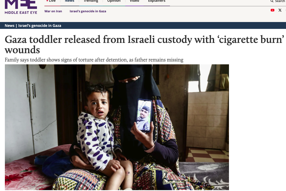 The claim seems to have appeared in reporting carried by TRT World, the Turkish public broadcaster, which alleged that a Palestinian toddler had been abused in Israeli custody, including claims of cigarette burns used to pressure his father during interrogation.