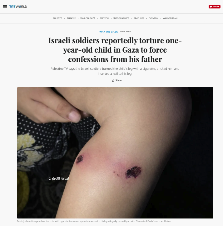 The claim seems to have appeared in reporting carried by TRT World, the Turkish public broadcaster, which alleged that a Palestinian toddler had been abused in Israeli custody, including claims of cigarette burns used to pressure his father during interrogation.