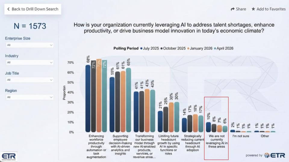The slide below is a check on how organizations say they are using AI in the current climate (N = 1,573), and it has been asked consistently since July 2025. The top answer is what you’d expect – enhancing workforce productivity through automation or task augmentation. That answer has stayed consistently in the low 70% range range and has been durable across multiple quarters. The question we see organizations asking is: How do we make new breakthroughs beyond early use cases? In other words, firms are seeing early wins but they’re eager to see them compound.