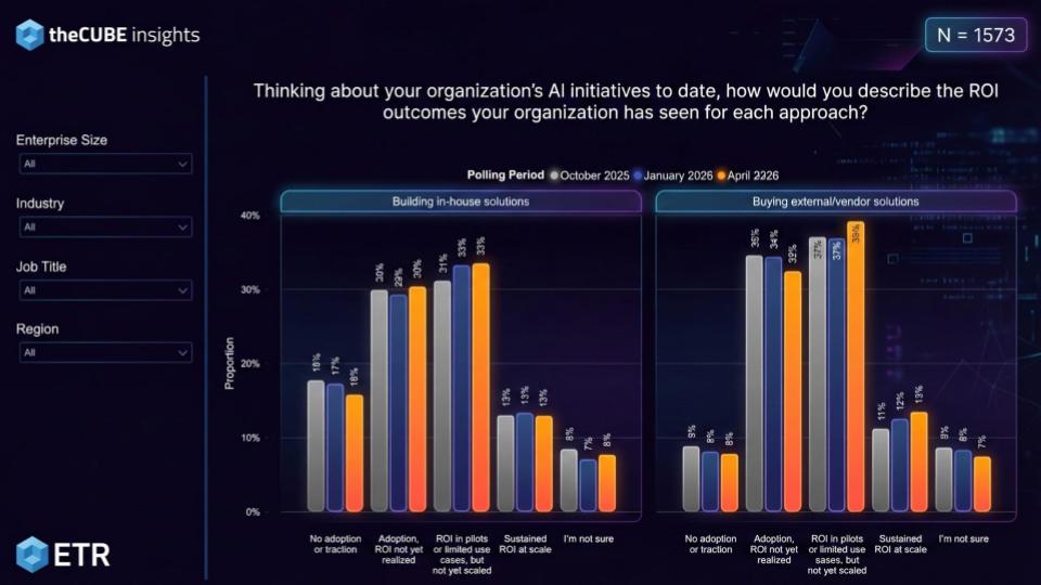 The chart below gets to the heart of the agentic gap – what kind of ROI organizations are actually reporting from AI initiatives so far (N = 1,573). ETR splits the data into two approaches: building in-house solutions on the left and buying external vendor solutions on the right. In both cases, “no adoption or traction” is declining, but it remains meaningful – especially on the in-house side. Embedded AI and vendor-delivered capabilities appear to have an path to adoption, which shows up in the lower “no traction” bars on the right-hand side.
