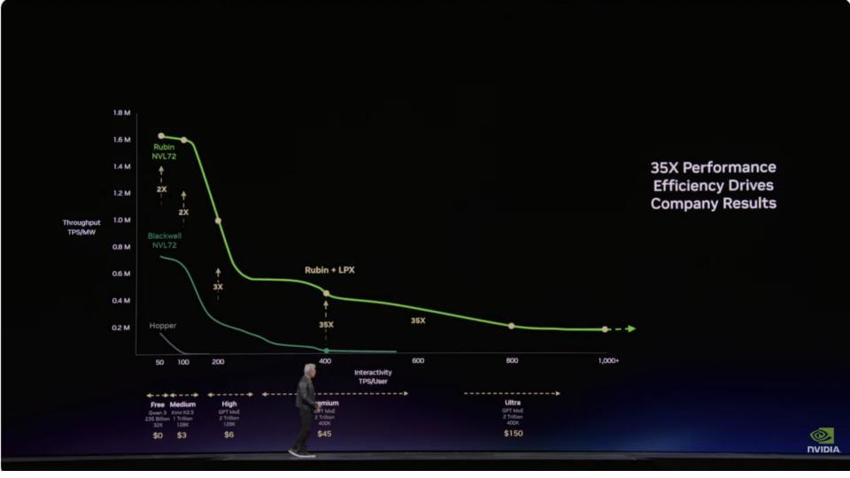 That’s where the Groq integration and Nvidia’s $20 billion Groq investment starts to makes sense. Rubin + LPX extends the curve further to the right – preserving throughput while improving interactivity. The implication is that the platform that can move the curve right without collapsing the curve down gets to charge for use cases that are sensitive to responsiveness, especially in agentic workflows and edge inference. The spectrum goes from freemium (free ChatGPT) to paid ($20/month) to higher-paid tier ($200/month) to coding assistance to super-low-latency agentic– ultra-expensive but worth it because it drives revenue.