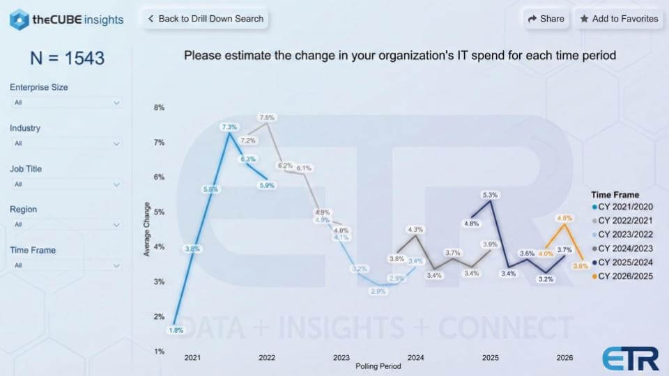 The first chart is the one we keep coming back to because it shows a time series on macro spending sentiment. It’s from ETR’s quarterly drill-down survey of expected IT spending changes, going back to the COVID era, with a large sample size (N = 1,543). The story is one of a whipsaw between optimism and caution – and how quickly sentiment moves when world events get in the way.