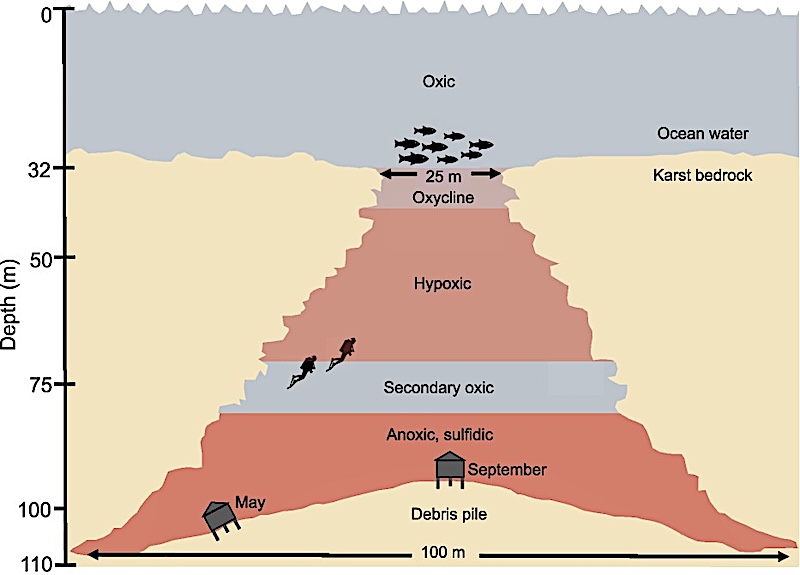 Dissolved oxygen became depleted at the hole’s rim (32 m water depth), remained low but detectable in an intermediate hypoxic zone (40–75 m), and then increased to a secondary peak before falling below detection in the bottom layer (80–110 m), concomitant with increases in nutrients, dissolved iron, and a series of sequentially more reduced sulfur species.