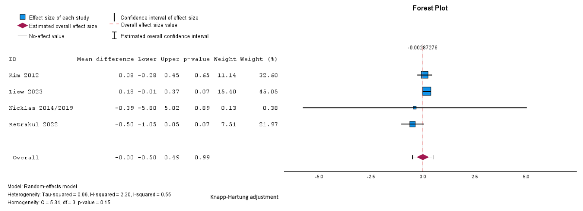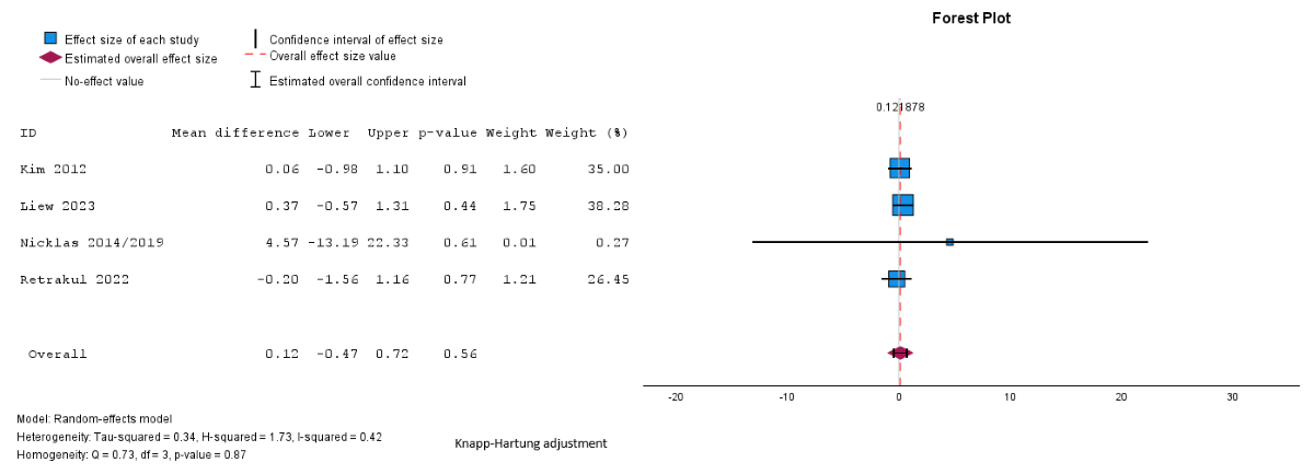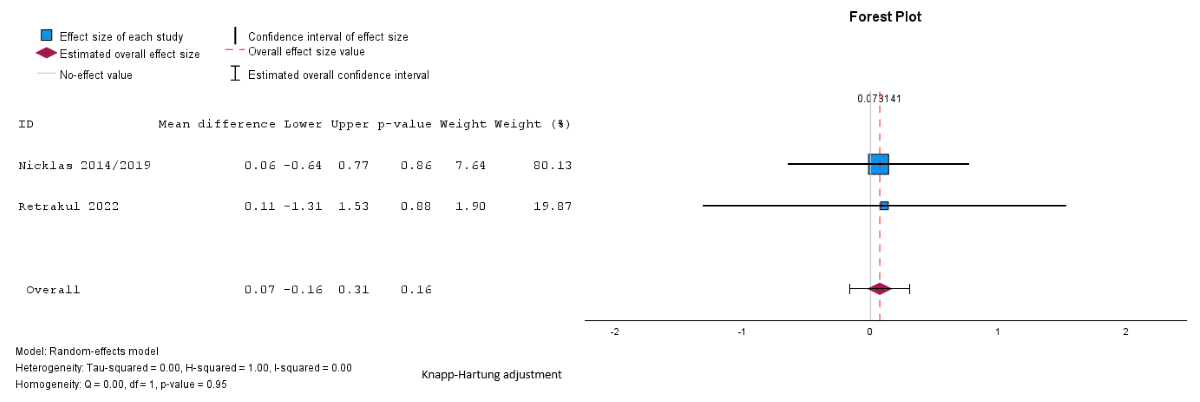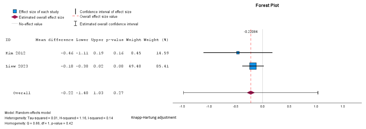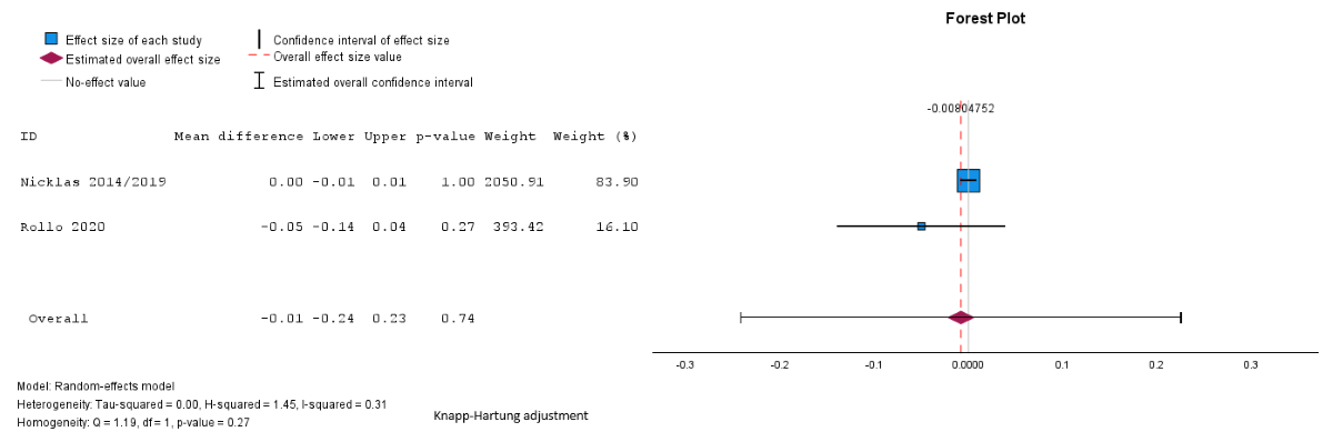 Pooled analysis showed a reduction in BMI in the intervention group compared to the control group, but the difference was not statistically significant (mean difference –0.22, SE 0.1, 95% CI –0.4 to –0.01 kg/m2; P=.27; n=2 [,]; GRADE very low; [,]). The I2=41%; τ=0.1; and τ2=0.01 indicated lower heterogeneity. Subgroup analyses were not possible for BMI because of the small number of studies assessing these outcomes and the uneven distribution of studies across the different subgroups.
