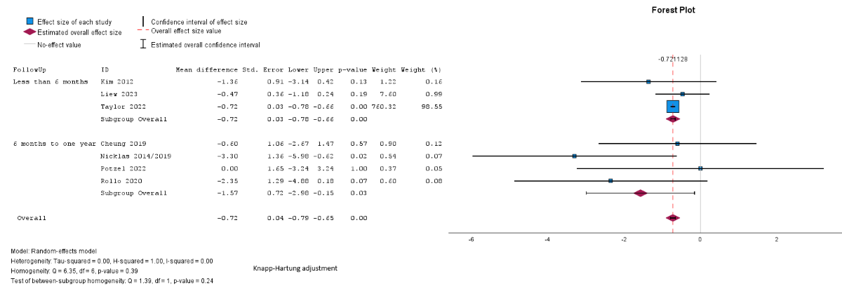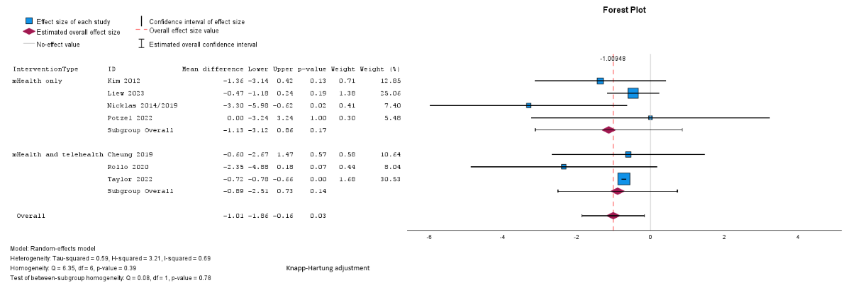 Pooled analysis showed significantly greater weight loss in the intervention group compared with the control (mean difference –1.01, SE 0.35, 95% CI –1.86 to –0.16 kg; P=.03; n=7; GRADE very low; [,,,,,,]). τ2=0.59; τ=0.77; and I2=69% indicated higher heterogeneity. The effect did not remain significant across different modes of delivery and lengths of follow-up in subgroup analyses, although there was a larger reduction in weight noted among studies using technology-based delivery only (mean difference –1.13, 95% CI –3.12 to 0.86 kg for technology-based only, mean difference –0.89, 95% CI –2.51 to 0.73 kg for mixed delivery; ) and with a longer follow-up duration (mean difference –0.70, 95% CI –1.21 to –0.18 kg for follow-up <6 months; mean difference –1.58, 95% CI –3.93 to 0.76 kg for 6-12 months; [,,,,,,]) but between-group differences were not significant for mode of delivery (χ21=0.08; P=.78) or follow-up duration (χ21=1.06; P=.30).