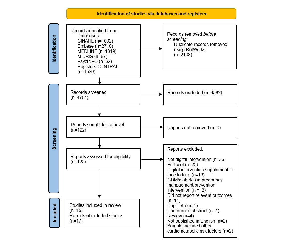 shows a PRISMA flow diagram of studies identified by the search. A total of 4704 papers were returned by the search, of which 4582 were excluded at the title and abstract screening stage. We reviewed the full text of 122 papers, and 15 studies [-] reported in 17 papers [,] were deemed eligible for inclusion in the systematic review. At the full-text screening stage, the following exclusions were made: 26 nondigital interventions, 23 protocols, 16 interventions where the technology-based component was a supplement to face-to-face, 12 interventions for the management or prevention of gestational diabetes, 11 papers that did not report relevant outcomes, 5 duplicates, 4 review papers, 2 papers not published in English, 2 papers that included women with additional cardiometabolic risk factors in the sample, and 1 conference abstract. A total of 4 conference abstracts were reviewed that did not contain enough information to assess eligibility. We searched the 4704 abstracts identified by our review by author name and intervention name, as outlined in the conference publications, to identify any further publications relating to these interventions. For 3 of the 4 conference abstracts, further publications with more information were identified that allowed assessment of eligibility. There were no related papers found for the fourth conference abstract, and no email addresses could be found for the authors through web searches, so the study was excluded from the review [].