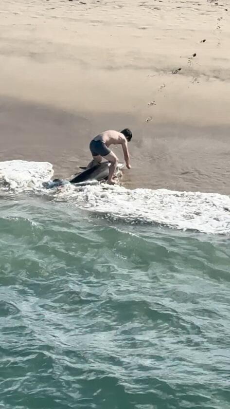 A fisherman used scissors and his bare hands to free a juvenile great white shark caught on a fishing line by the Hermosa Beach Pier around 9:20 a.m. on Wednesday, April 1, 2026. (Video courtesy of Alexandra Garry).